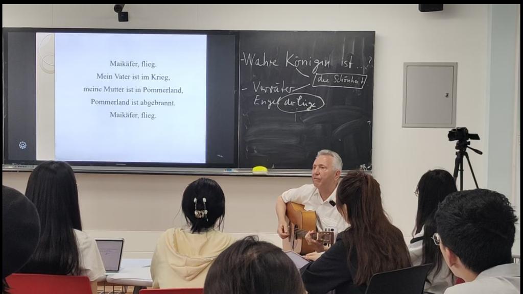 Gärtner博士在讲座中对所编写教材的五个单元进行了介绍,并结合具体的诗歌对相关主题进行了详细剖析,与师生们共同含英咀华,进行一场文学、音乐、美学之旅。针对第一单元的摇篮曲主题,Gärtner博士指出,作为民歌的摇篮曲以其简单明了的旋律和丰富多变的内容承载了德国的民族记忆,是洞察德意志民族历史的一条脉络。第二、三单元聚焦德国诗歌中“月亮”和“花”两大常见意象。通过考察不同时期的诗作,Gärtner博士总结了二者的美学内涵:在德国诗歌中,月亮常寓意心灵的归属,赏月的诗人往往将自己视作和谐自然中的一部分;花则多象征爱情,诗歌中经常表达的是对爱情的渴望。第四单元探讨“幸福”这一主题。Gärtner博士以德国诗人席勒和福格威德的诗篇为例,指出幸福不仅是个人生活的追求目标,也是全社会共同追求的理想,同时,他还将两首诗歌与中国寓言《塞翁失马》进行了对比分析。第五单元的主题是爱国诗歌。Gärtner博士以史为鉴,首先回顾了德意志民族的坎坷历史,并以歌德等诗人的诗歌为例,考察德国长期分裂的历史创伤在众多爱国诗歌中的反映。在讲座中,为了让大家体会诗歌的音乐美,Gärtner博士在报告现场以吉他弹唱的方式演绎诗歌,并与师生共同吟唱,充分调动了大家的参与积极性。两场讲座均座无虚席,师生们与Gärtner博士积极互动,乘着歌声的翅膀,徜徉在诗歌的乐土!余音绕梁,意犹未尽!