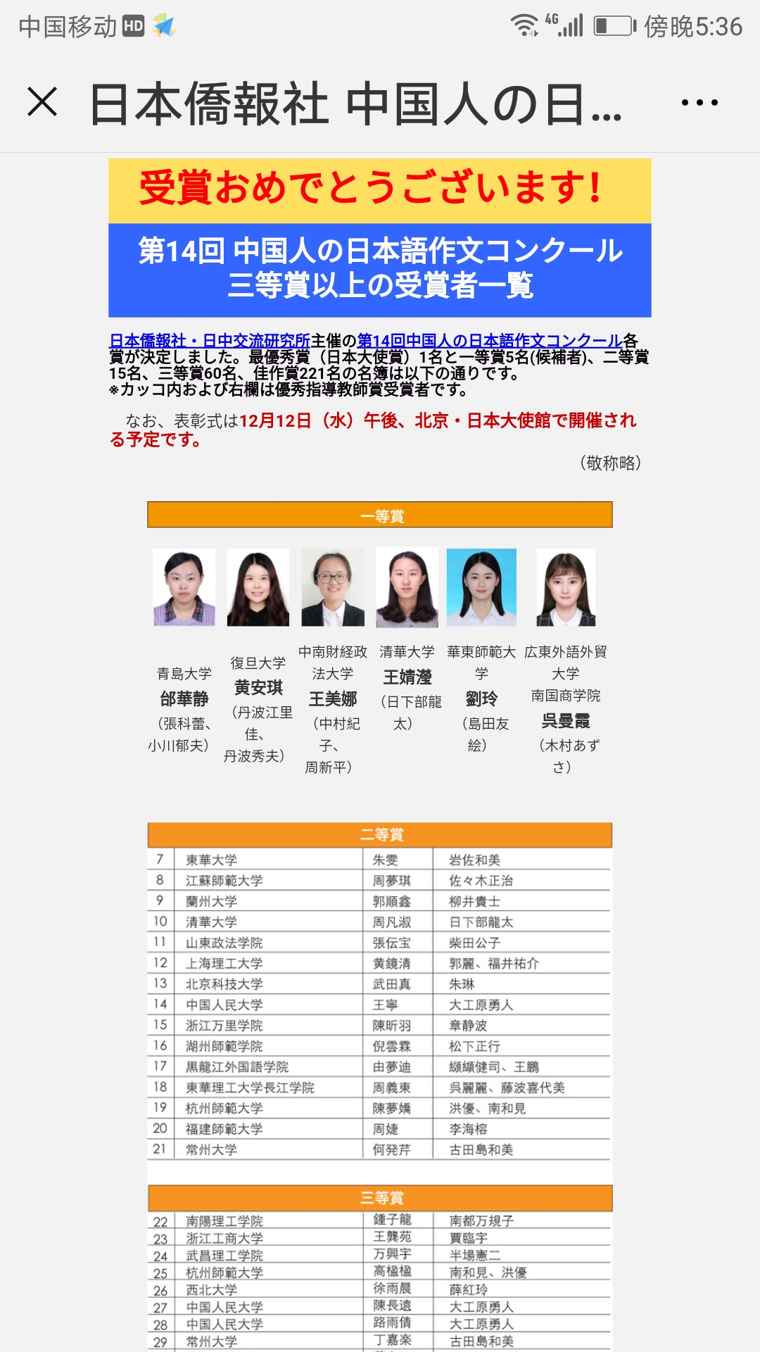 、复旦大学、中南财经政法大学、清华大学、华东师范大学、广东外语外贸大学,我校现排名首位,之后将由日本驻华大使等评委于11月从上述六所高校中评选出“最优秀奖・日本大使奖”1名。