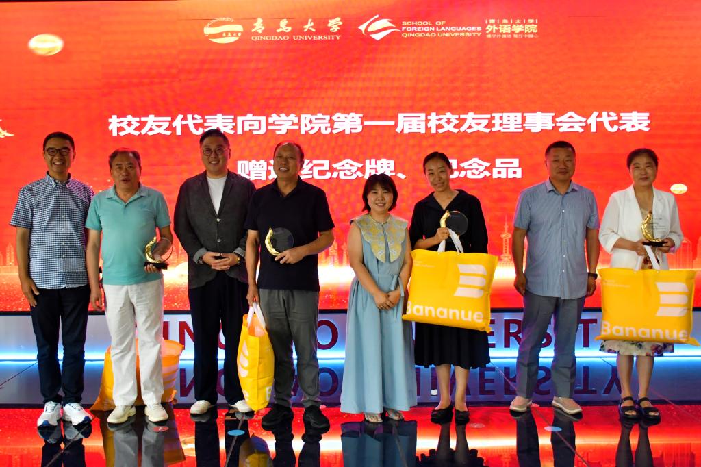 校友代表向第一届校友理事会成员代表赠送纪念牌、纪念品、校友代表向外语学院老领导、老教授赠送鲜花、纪念品,致敬他们为外语学院校友工作发展做出突出贡献。